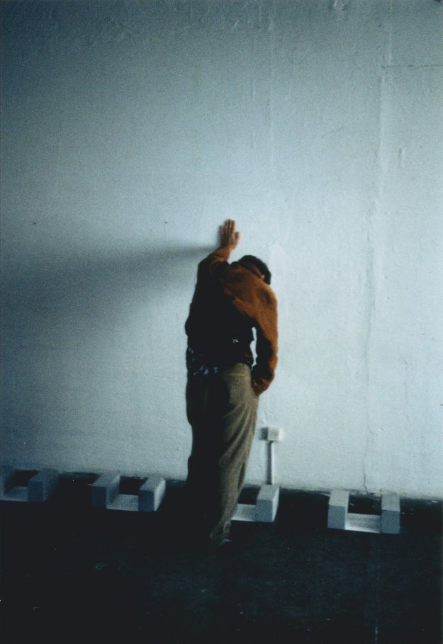 Image: Anchan/Anna Daučíková looking at Acquabelle II, an installation realised with Christina Della Giustina at Projekt Raum, Zürich, 1995